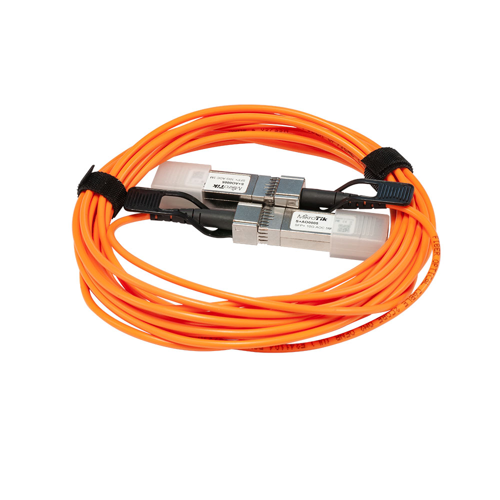 Cable de conexión directa óptica activa SFP+ de 10 Gbps y 5 m. Es una forma muy rentable de conectar dos dispositivos SFP/SFP+ en distancias muy cortas, tanto dentro de racks como entre racks adyacentes. Compatible con todos nuestros productos con puertos SFP/SFP+, incluida la nueva serie RB4011 (la serie RB4011 no es compatible con nuestros cables pasivos de conexión directa S+DA0001 y S+DA0003).
